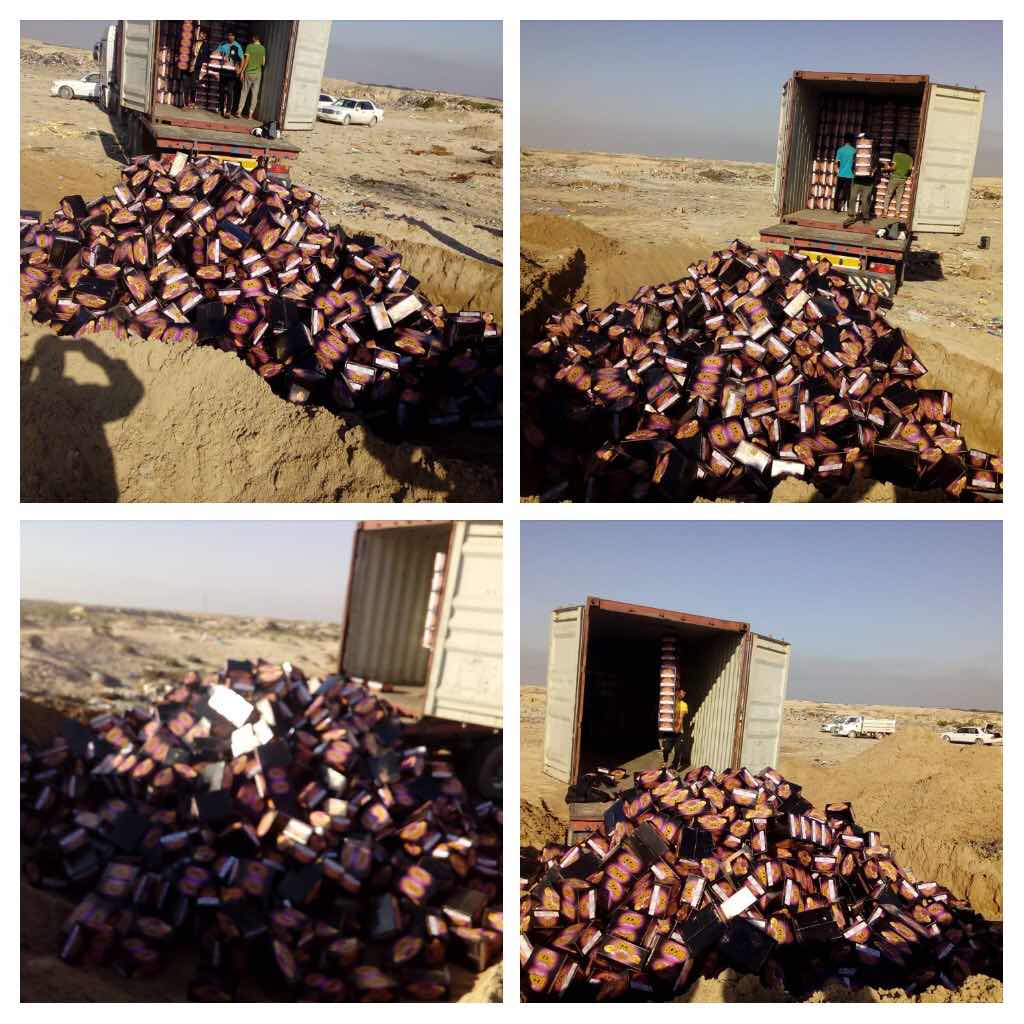 اليوم السبت ٢٠١٩/١٢/٢١ عن إتلاف ارسالية تتكون من سبعة أطنان كيك مستورد منتهية الصلاحيه محمله في حاويه حجم ٤٠ قدم في كمرك ام قصر الجنوبي .